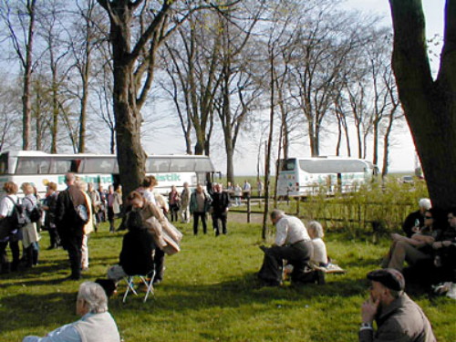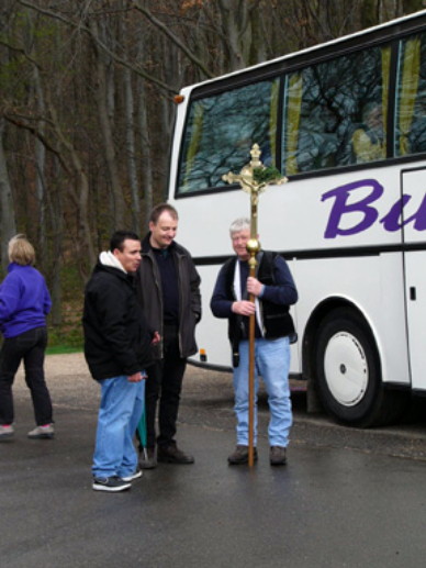 Rast in Dirlau. Zwei Busse begleiten die Betenden